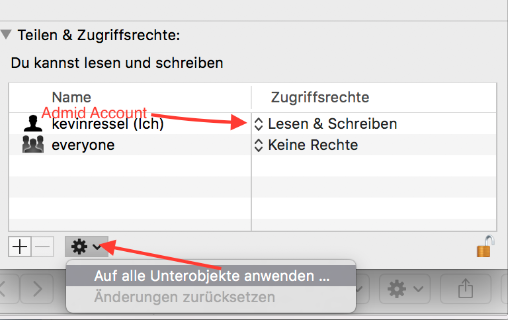 4. Setzen Sie die Berechtigungen neu. Der Admin Benutzer benötigt Vollzugriff, Everyone keine Rechte. Zum Schluss müssen die Berechtigungen auf die Unterordner übertragen werden (Rädchen).