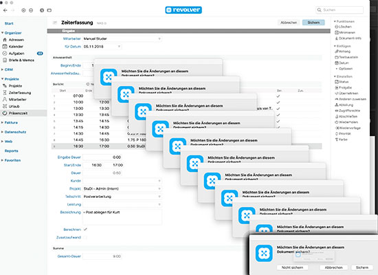 Wenn ich abends meine letzten Zeiteinträge mache und die Zeiterfassung ausfülle, sichere (command-shift-s) aber NICHT schliesse und dann die Applikation schliesse (command-q), explodiert Revolver mit Speicher Dialogen. Sie lassen sich nur mit "Abbrechen" schliessen, nicht mit "Sichern".
