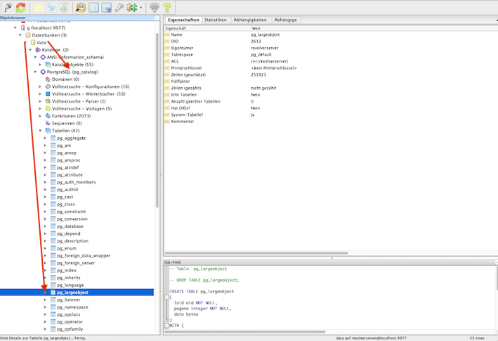 Dokumente, Bilder, Anhänge, .. etc. werden als Largeobjects in der Postgres-internen Tabelle (pg_largeobject) gespeichert. Jedes Largeobjects hat eine OID. Diese OID wird im entsprechenden Datensatz gespeichert, ist aber in Revolver nicht sichtbar.