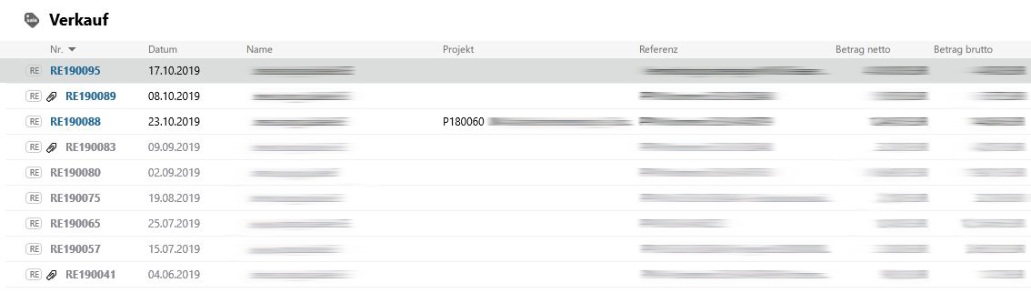 Dupliziert man eine Rechnung, die mit einem zuvor 'sichtbaren' Projekt verknüpft ist, wird das Projekt in der Übersicht angezeigt (Bsp. RE190088).
