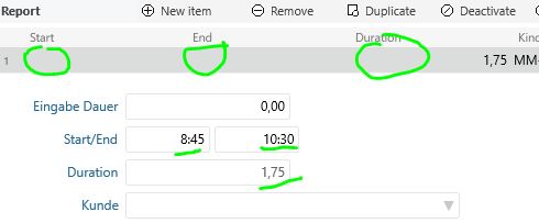 Unter Time Tracking > Time recording werden die Start und Endzeiten, sowie die Dauer der eingetragenen Abschnitte nicht überblicksmäßig in der Liste angezeigt.