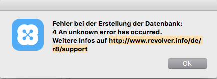 Gerade habe ich versucht, durch Umbenennen des Ordners »Database« Revolver zu öffnen, um ein Backup einzuspielen. Leider gibt es eine neue, andere Fehlermeldung, die besagt, dass eine leere Datenbank nicht erzeugt werden konnte.