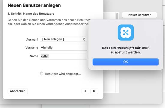 Ich versuche zur Zeit, eine neue Benutzerin auf dem Server anzulegen, komme aber über den ersten Schritt nicht hinaus. Kann auch aus dem Dropdown keine existierende Person auswählen und zuweisen. Siehe Fehlermeldung im Screenshot.