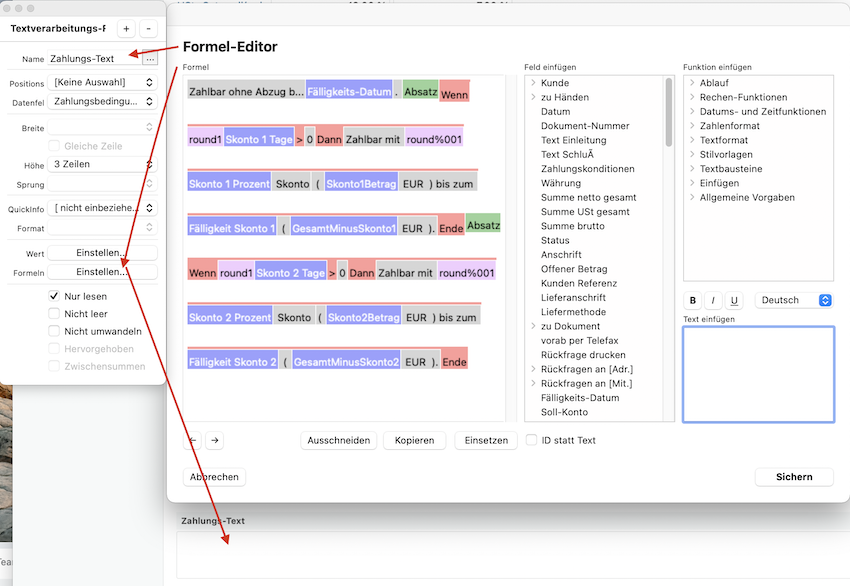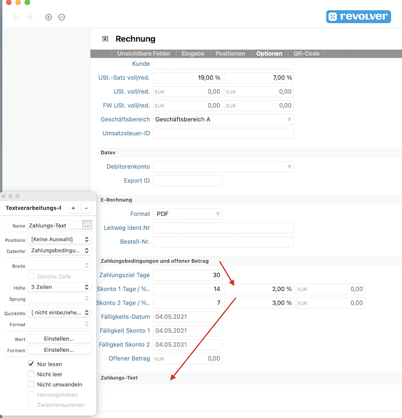 die Zahlungsbedingungen werden im Dokument ‚Rechnung‘ unter ‚Optionen‘ definiert. Das Feld ‚Zahlungs-Text‘ wertet die Eingaben aus. Im Design-Modus kann diese Formel verändert werden.