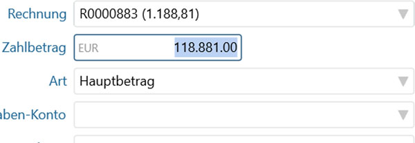 Die Anlage von Zahlungseingängen ist seitdem fehlerhaft, die Summen aus den hinzugefügten Rechnungen werden falsch übernommen: